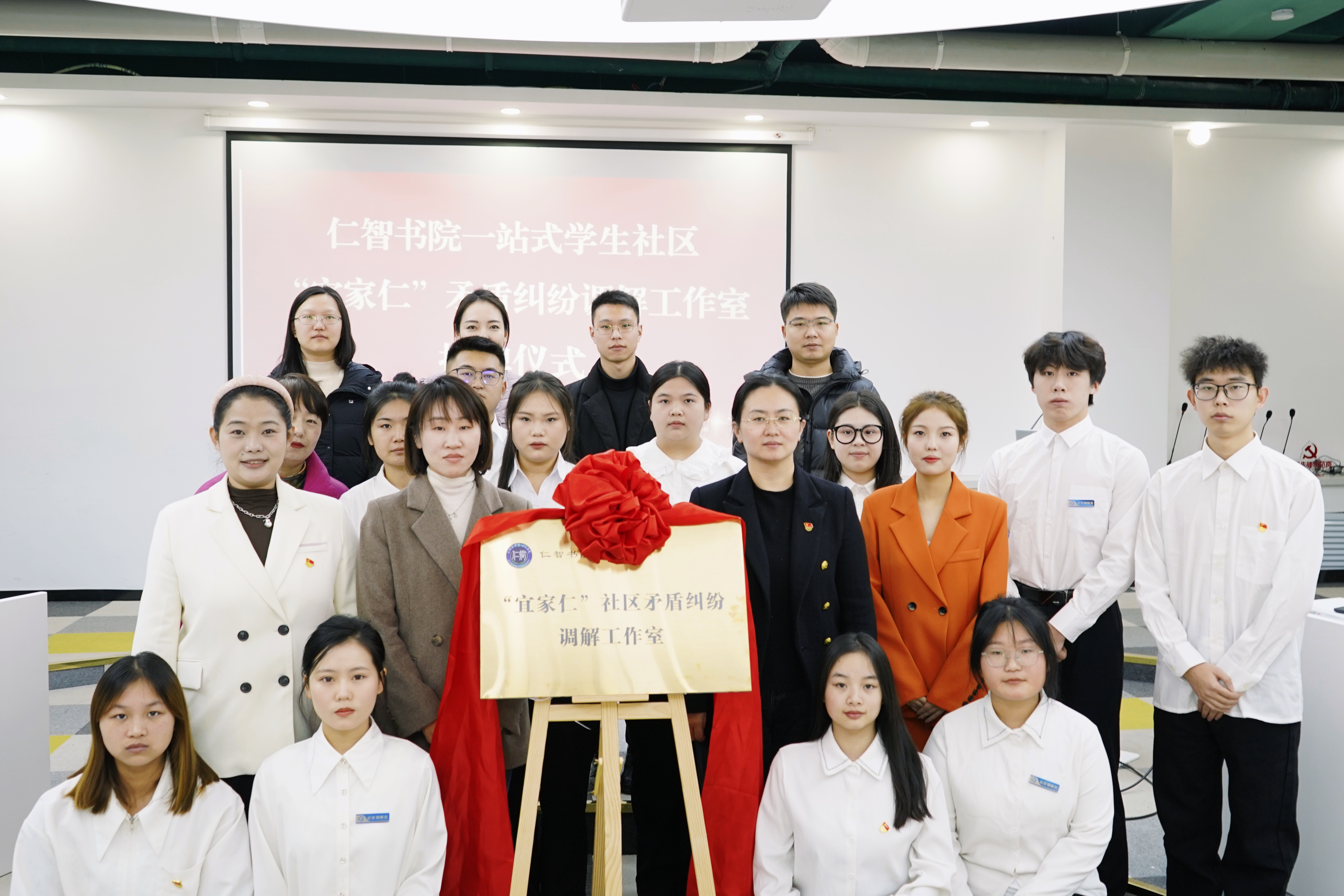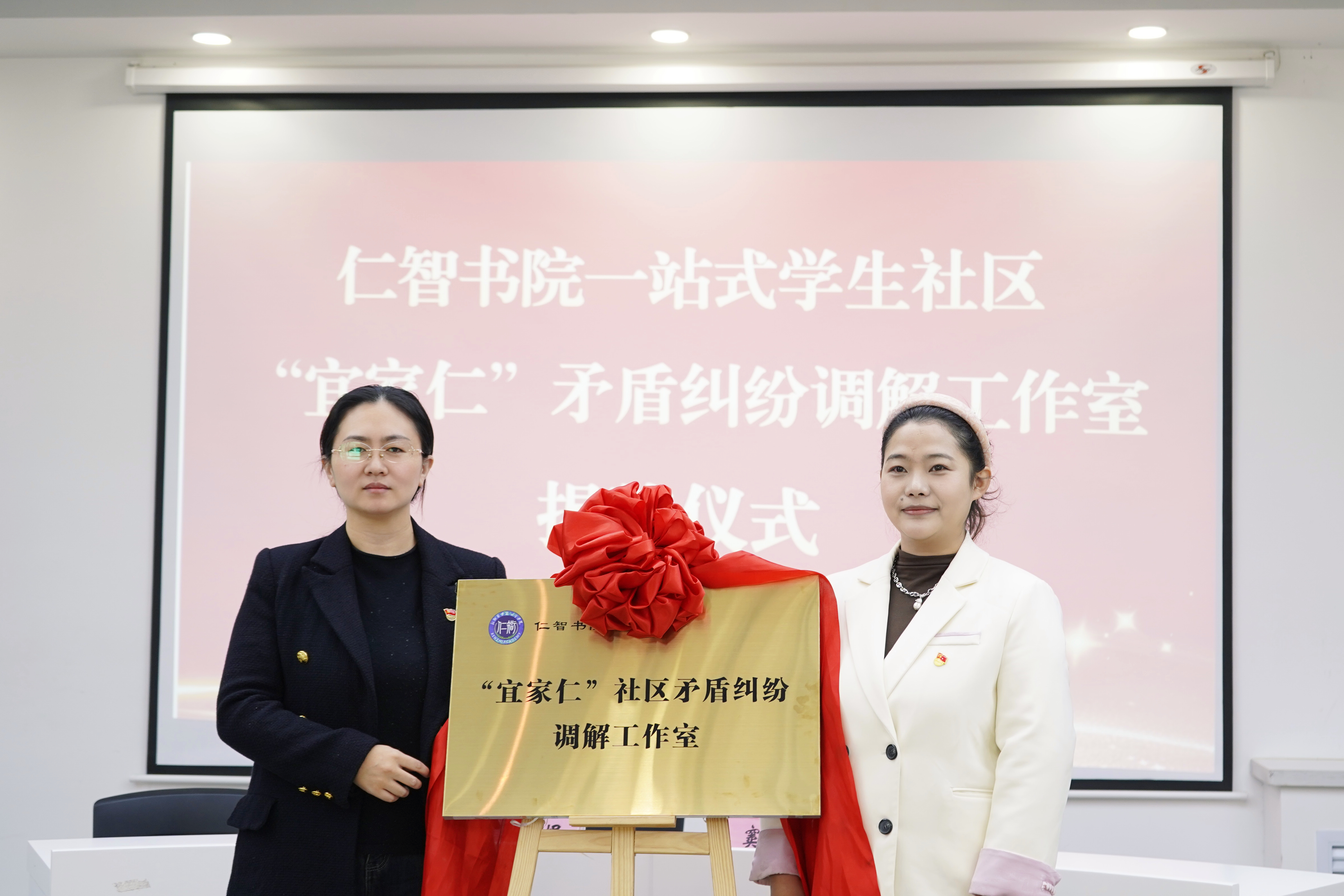 为进一步提升仁智书院矛盾纠纷预防化解能力,深入践行“枫桥经验”,12月18日,仁智书院“宜家仁”社区矛盾纠纷调解工作室揭牌仪式在学生活动中心隆重举行。仁智书院党总支书记马苏娟、院务主任窦倩、学校心理健康教育指导中心教师王绍瑜、仁智书院辅导员及学生代表出席本次仪式,现场气氛庄重而热烈。