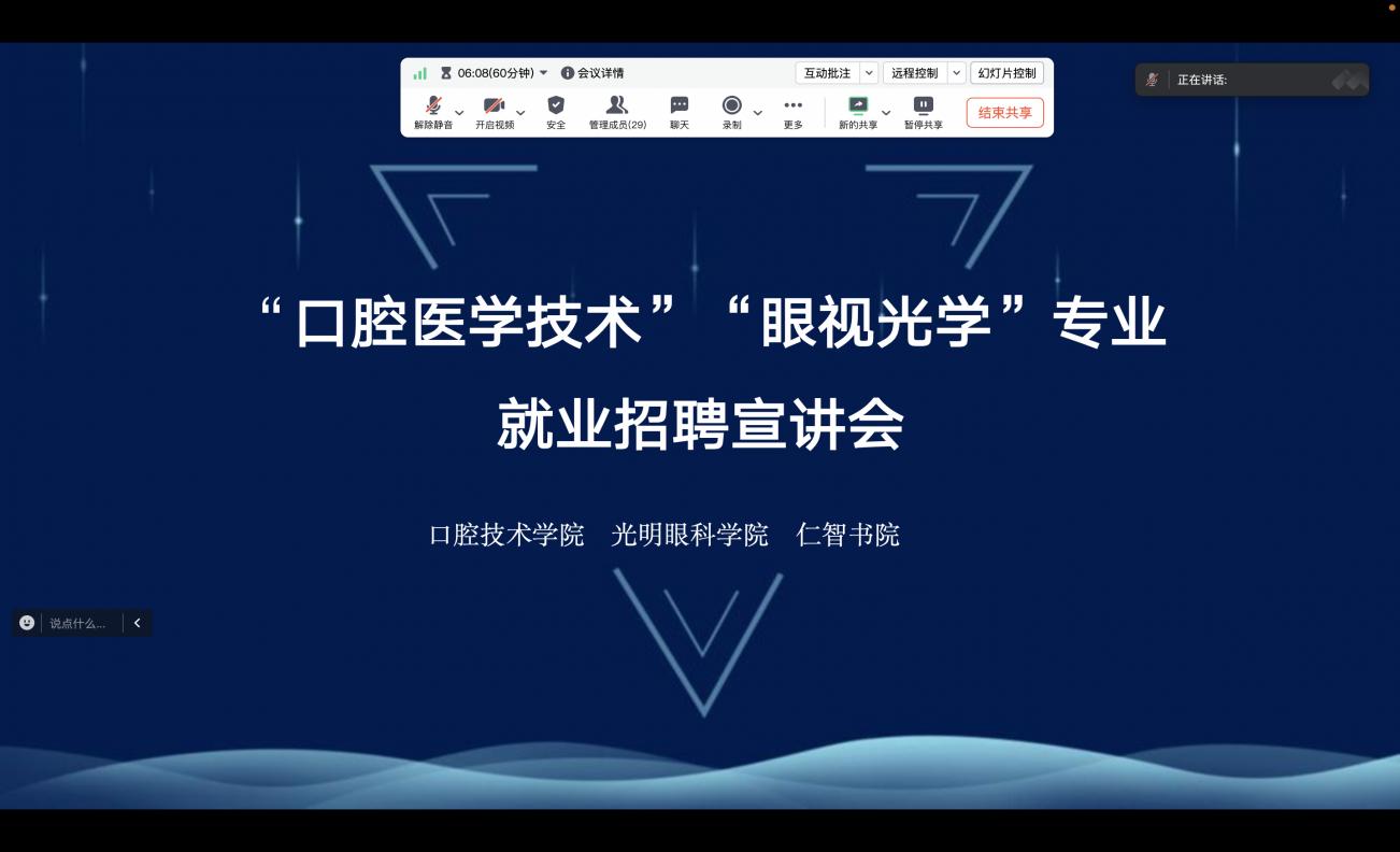 此次线上招聘宣讲会的成功举办,不仅为同学们拓宽了就业渠道,提供了宝贵的求职机会,同时也进一步加深了我院与口腔技术学院、光明眼科学院的双院协同合作。接下来,仁智书院将继续积极搭建就业招聘平台,拓展就业岗位渠道,全力推动2025届毕业生实现高质量充分就业。