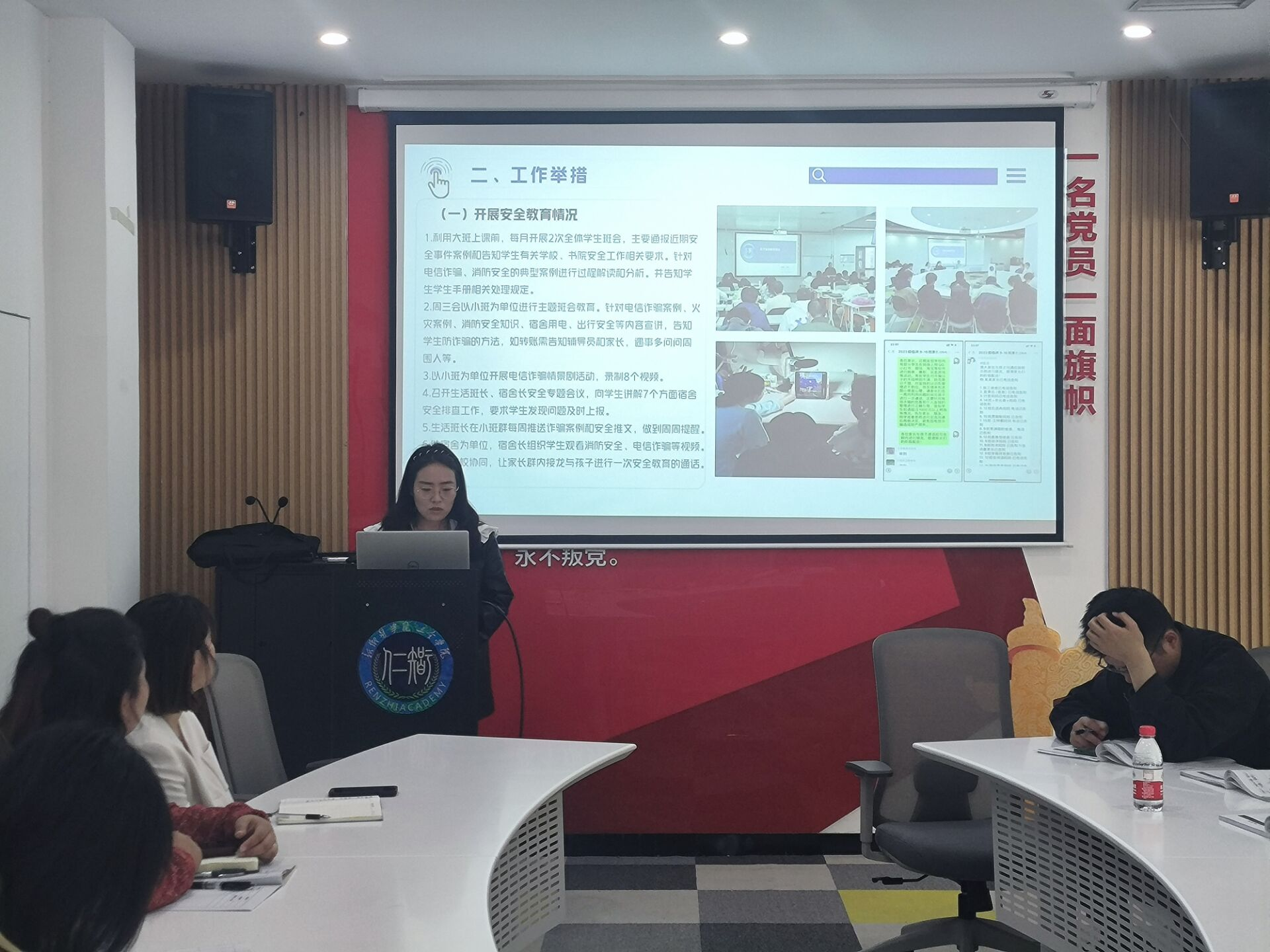 汇报结束后,窦倩强调安全工作是书院各项工作的重中之重,关乎学生的生命财产安全和学校的稳定发展。辅导员作为学生日常管理的直接责任人,生活老师作为宿舍安全直接负责人,要时刻保持高度的责任感和使命感,将安全工作做细做实。一要持续加强安全教育,保障学生生命财产安全,不断创新教育方式方法,以学生喜闻乐见的方式提高学生的安全防范意识和自我保护能力;二要聚焦重点群体、重要时段,强化常态化安全宣传教育和开展常态化隐患排查,完善风险应急机制,全力以赴织密校园“安全网”。加强心理健康教育,关注学生心理健康状况,及时提供心理支持和帮助。三要完善突发事件应急预案,加强对学生、班委的应急演练,提升学生应急处置能力,确保在突发事件发生时能够迅速、有效地进行应对。