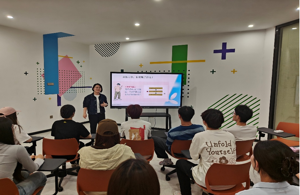 小组讨论环节,姜琳结合新生常见的适应焦虑、社交困惑等问题,引导学生分享情绪调节妙招。从“运动宣泄法” 到 “积极心理暗示”,同学们畅所欲言。姜琳通过案例解析与视频演示,系统总结了认知调节、注意力转移等科学方法,并带领小组进行情境模拟练习。