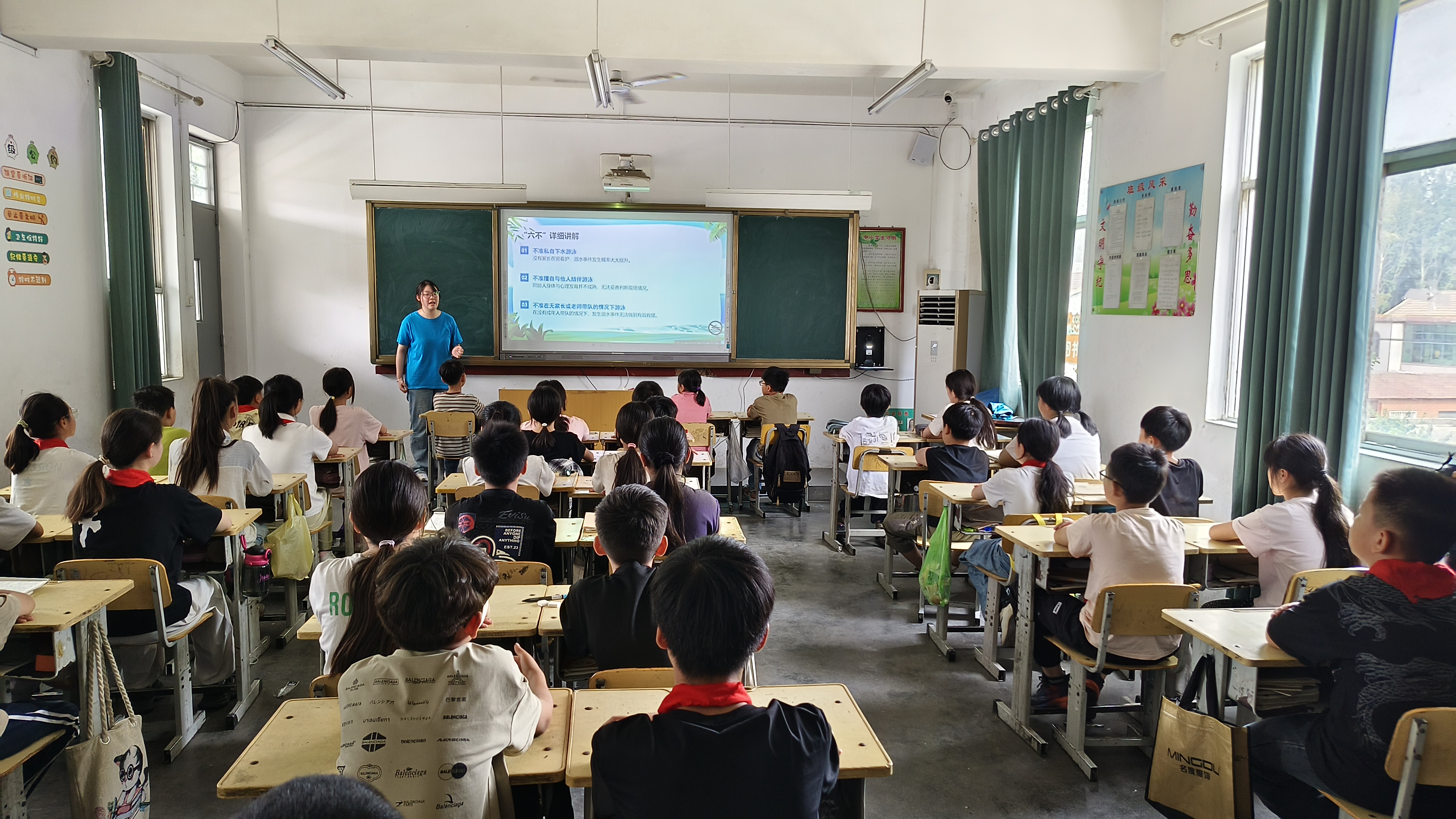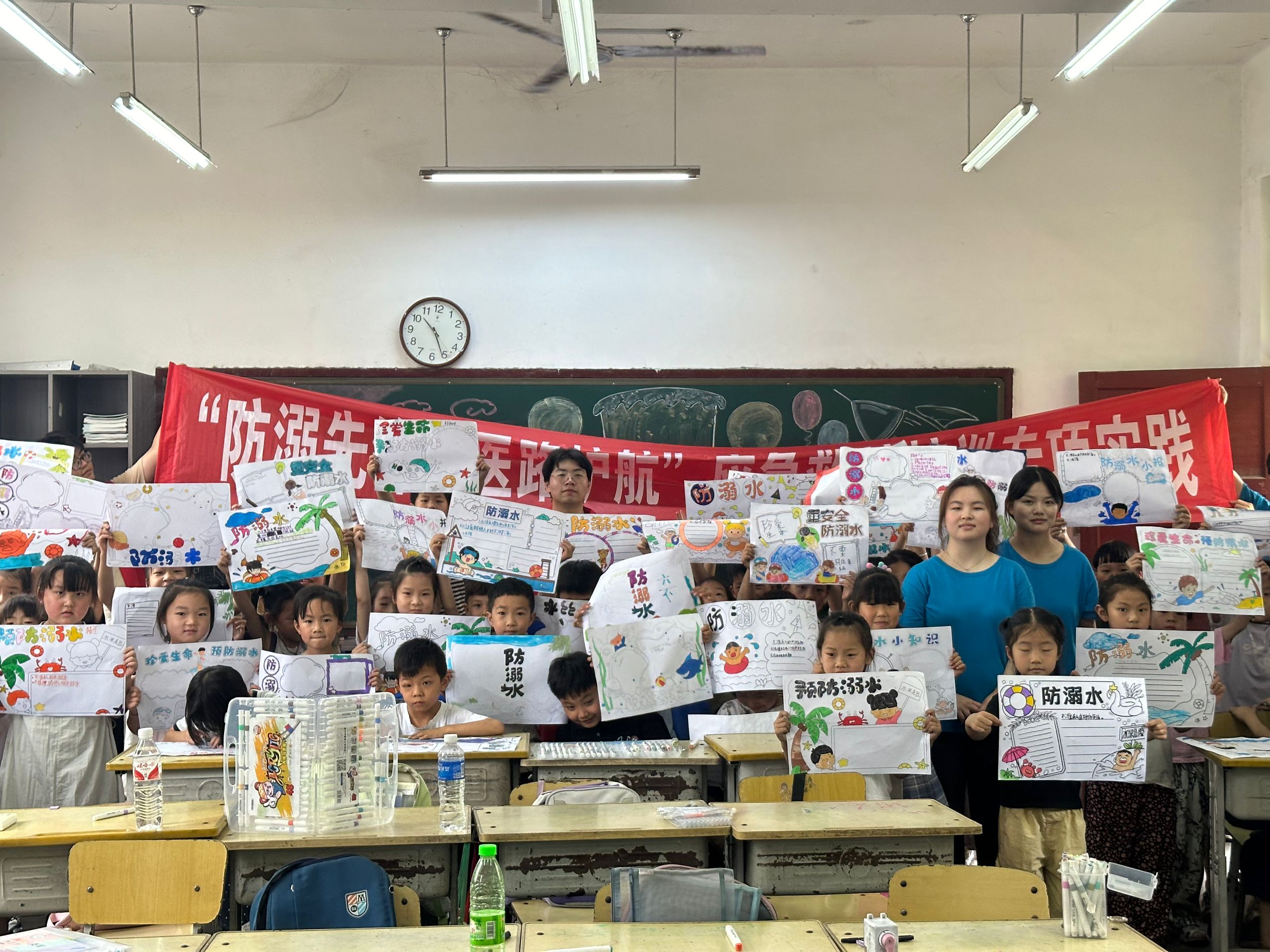 教室内实践团成员王新露打开精心制作的PPT,这堂“防溺水第一课”从孩子们熟悉的夏日场景切入——“河边摸鱼滑倒怎么办?”“同伴邀约去野塘游泳怎么拒绝?”结合真实案例与卡通插画,志愿者用童趣化的语言讲解“六不准”“四知道”等防溺水核心知识,还穿插了“危险水域大闯关”问答环节。“水库边有青苔会打滑!”“深水区可能有暗流!”孩子们举着小手争相抢答,课堂里不时响起清脆的笑声与掌声。随后,“安全手抄报大作战”将课堂氛围推向高潮,课桌上铺满彩纸、蜡笔,孩子们以“珍爱生命 预防溺水”为主题,用画笔勾勒出“安全小卫士”“急救小课堂”“我和家人的安全约定”等画面。“我要画一个警察叔叔救小朋友的场景!”“我在旁边写‘不私自下水’!”二年级的李同学举着自己的作品说,“这样的课比单纯听讲好玩多了,回家我要贴在床头提醒自己!”