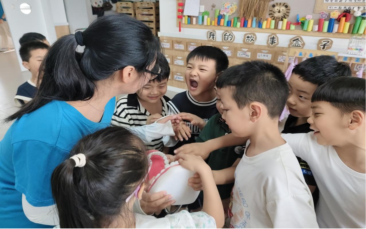 为了让孩子们更深入地了解牙齿健康,宣讲团成员带来了牙齿模型,现场演示了正确的刷牙方法。“蛀牙是怎么形成的?”“为什么吃糖会坏牙?”面对孩子们的提问,实践团耐心解答,并通过实验展示了酸性物质对牙齿的腐蚀作用,让孩子们明白少吃甜食、勤刷牙的重要性。一位小朋友兴奋地说:“我以后要少吃糖,每天认真刷牙!”