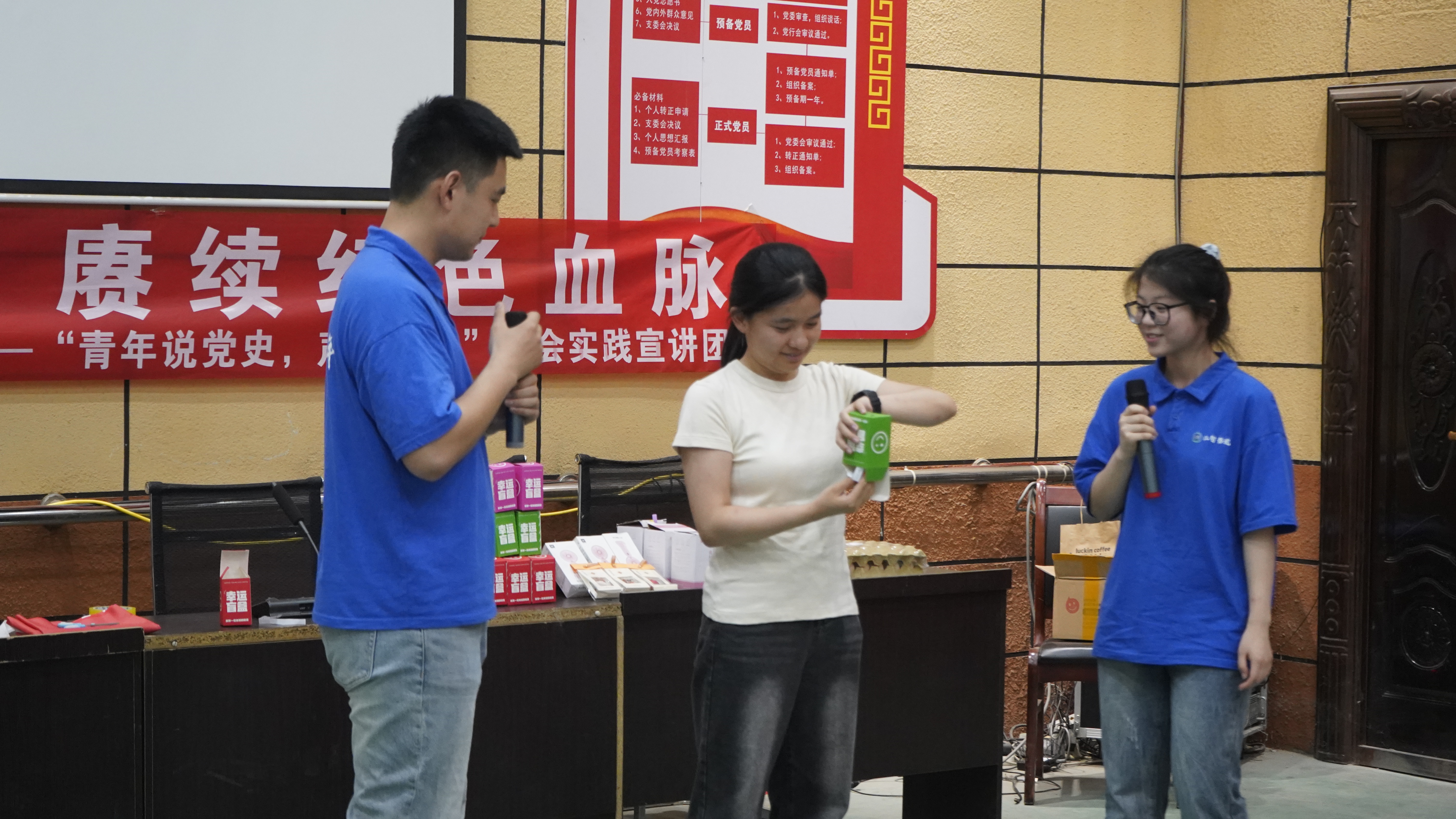 活动现场气氛热烈非凡。学生党员范兴、郑梓怡用通俗易懂的语言、生动形象的比喻和夸张有趣的肢体动作,将党史娓娓道来。“党史知识盲盒”互动环节,村民与青年学生通过随机抽取盲盒,参与党史知识问答,例如“中国共产党在抗战中的核心战略是什么?”“2025年是抗日战争胜利多少周年?”等问题,村民赵大爷与他的孙女组队参与答题,三代人的互动引起了热烈的掌声,激励了更多村民加入盲盒知识竞答中。