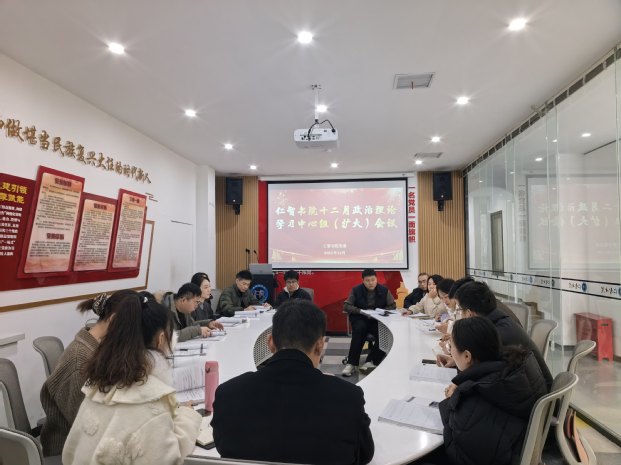 12月29日上午,仁智书院党委开展理论学习中心组(扩大)十二月份政治理论学习。会议由仁智书院党委书记刘小磊主持,党委理论学习中心组成员及教师党员参加。本次学习采用“书记领学+集中研讨”的方式进行。